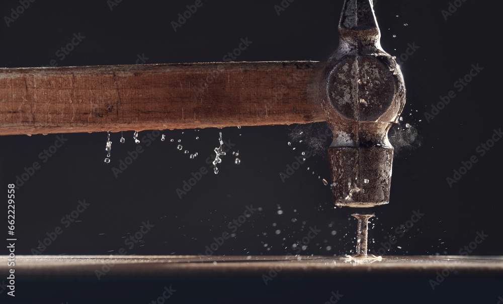 An old hammer hits a nail close-up on dark background. Dust rises from the impact. Carpentry concept.