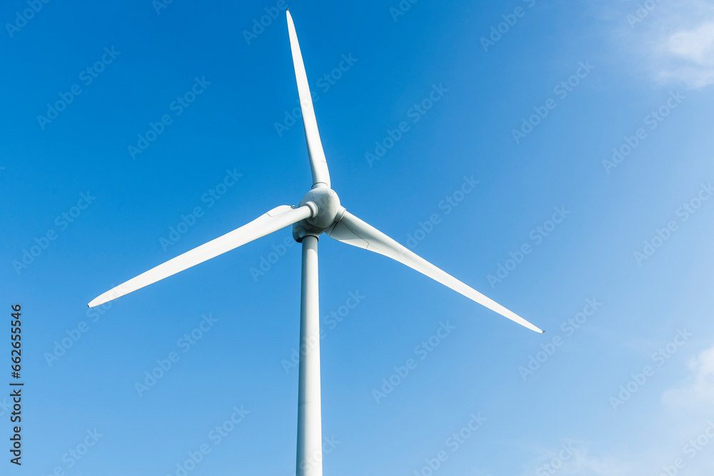 Close-up of wind power systems with the blue sky background.
