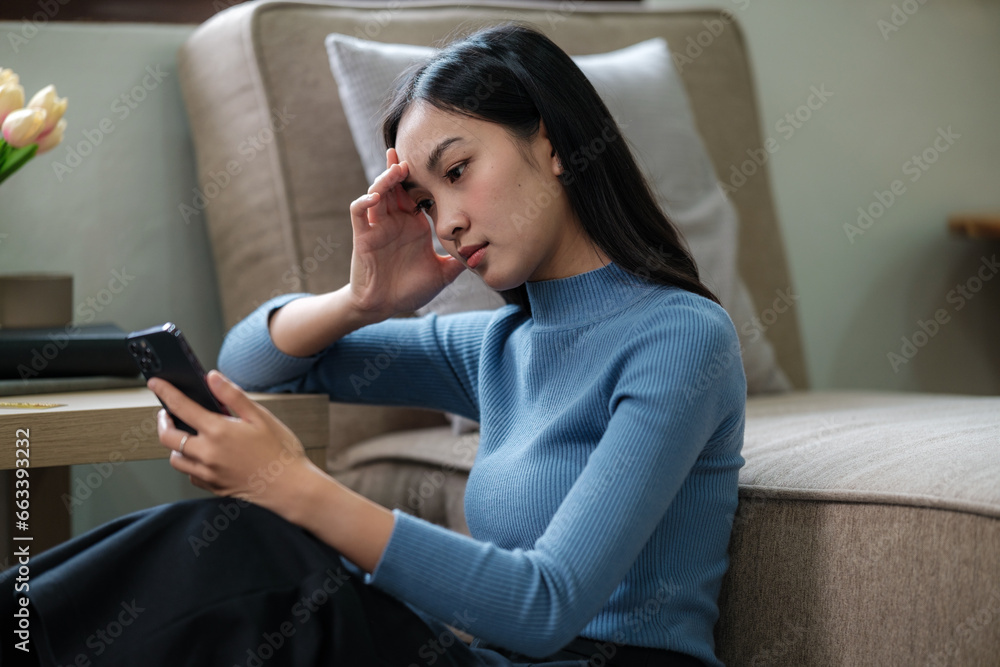 unhappy Asian pretty young woman siting alone on couch with feeling sadness , emotional young woman was depressed on sofa
