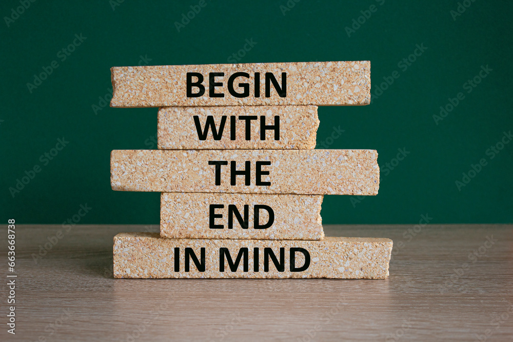 Begin in end of mind symbol. Concept words Begin with the end in mind on brick blocks. Beautiful wooden table green background. Business begin in end of mind concept. Copy space.
