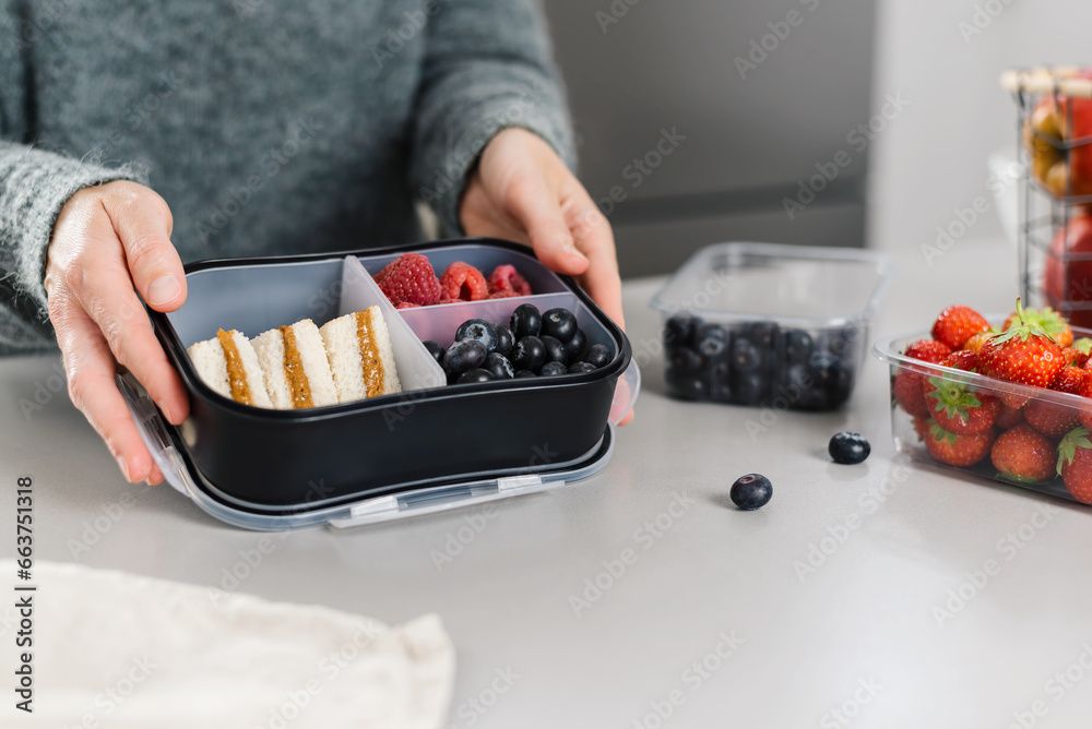 Mom prepares a lunch box with snacks lunch for her school child in the kitchen.