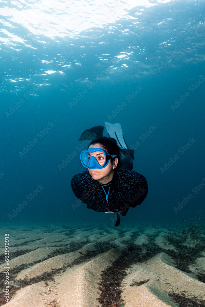 Chica joven haciendo snorkel, apnea en el mar Mediterráneo, fondos marinos.