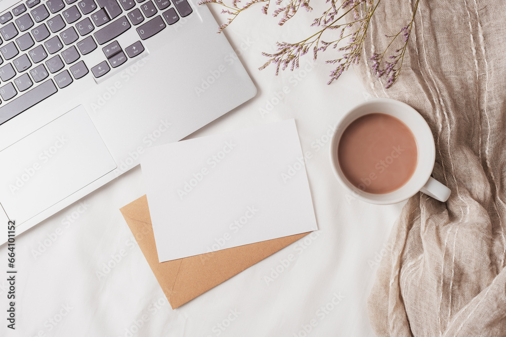 Coffee cup, laptop computer, envelope with blank card and small flowers on white linen. Cozy workplace, breakfast, comfort, hygge concept. Top view, flat lay, mockup