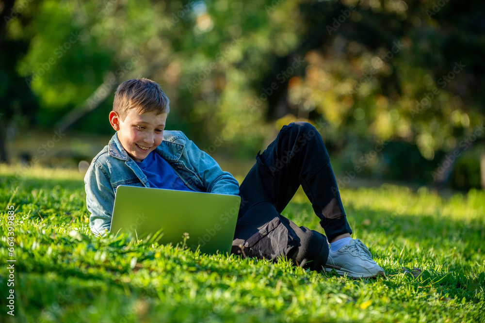 Happy teen boy with a laptop lies on green lawn on summer. Young smiling school boy is chatting online with friends in the park using laptop. Cheerful pupil learns remotely at a computer, outdoors.