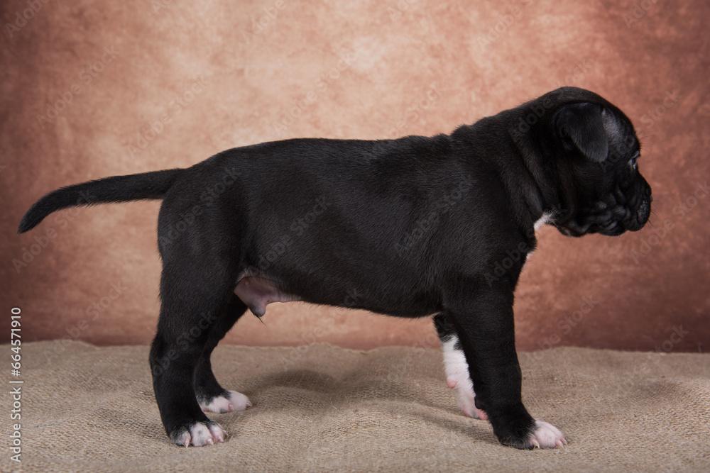 Cute American Staffordshire Terrier dog or AmStaff puppy on brown background