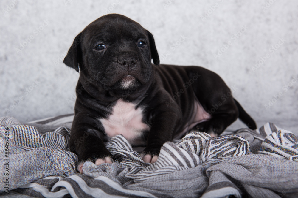 Cute small American Staffordshire Terrier dog or AmStaff puppy on gray background