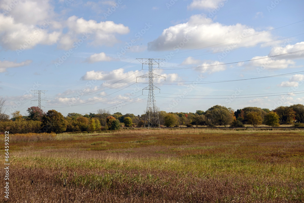 Rural Autumn Landscape with High Voltage Transmission Tower