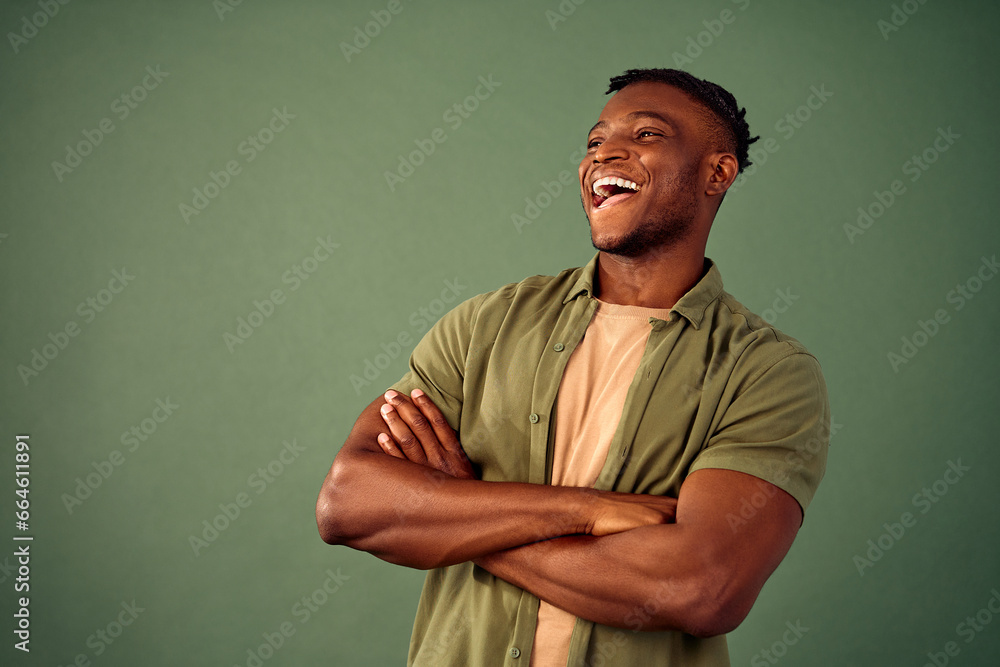 Emotions and feelings. Joyful afro guy laughing with open mouth while looking aside and keeping arms crossed over green background. Handsome surprised man wearing casual khaki shirt in studio.