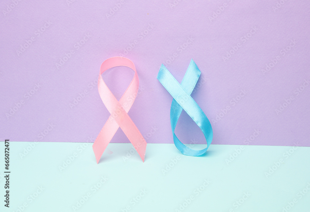 Pink breast cancer awareness ribbon and blue prostate cancer awareness ribbon on pastel background