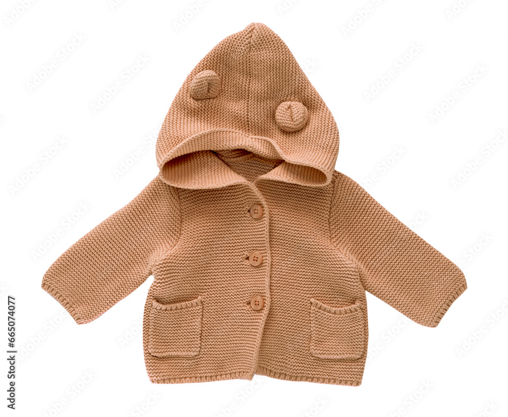 Brown knitted baby cardigan, winter woolen clothes. Child's sweater isolated.