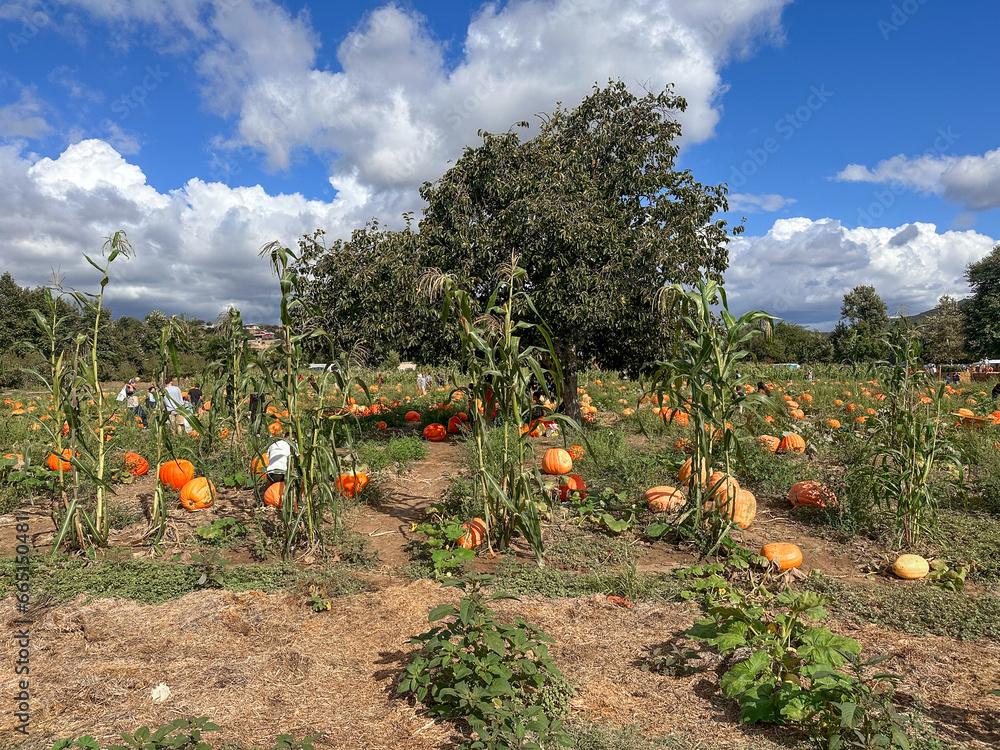 Autumn harvest of orange pumkins at hill side farmers field. High quality photo