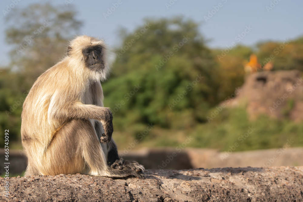 Northern plains gray langur, sacred langur, Bengal sacred langur, Hanuman langur - Semnopithecus entellus sitting on wall. Photo from Ranthambore Fort in Rajasthan, India. Copy space on right.