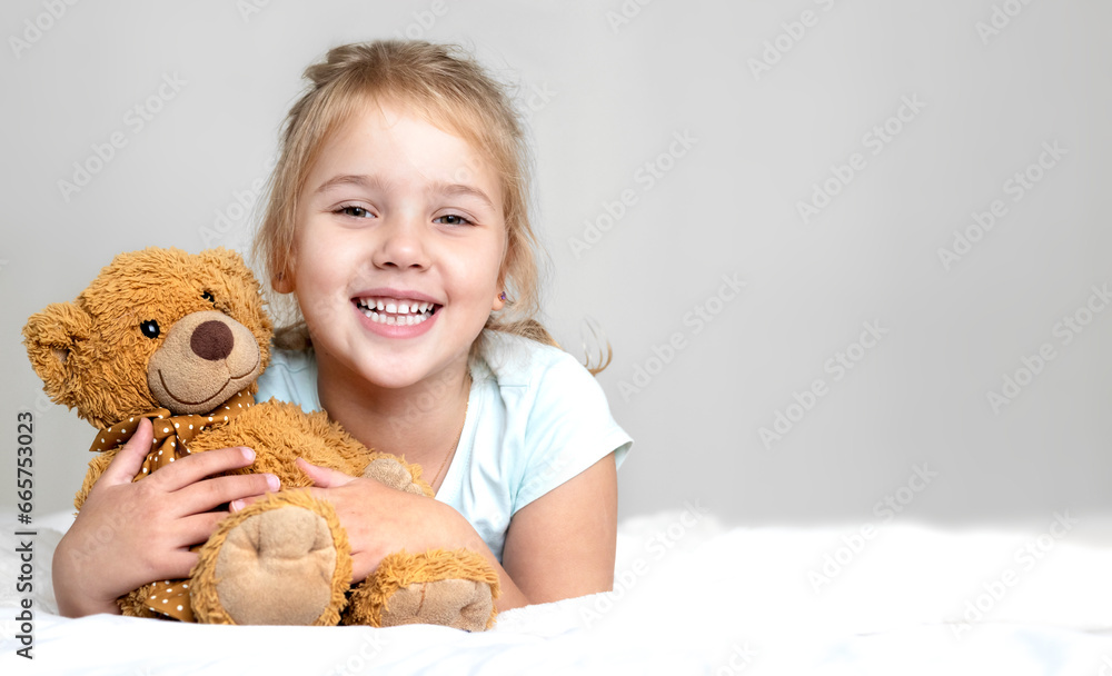 Child girl happy smiling face with teddy bear in hands. Childhood concept, empty copy space.Kid with plush toy.