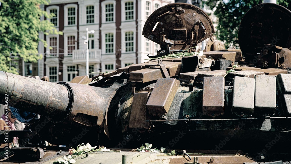Tanque de guerra russo enferrujado em exposição na capital europeia, Amsterdão
