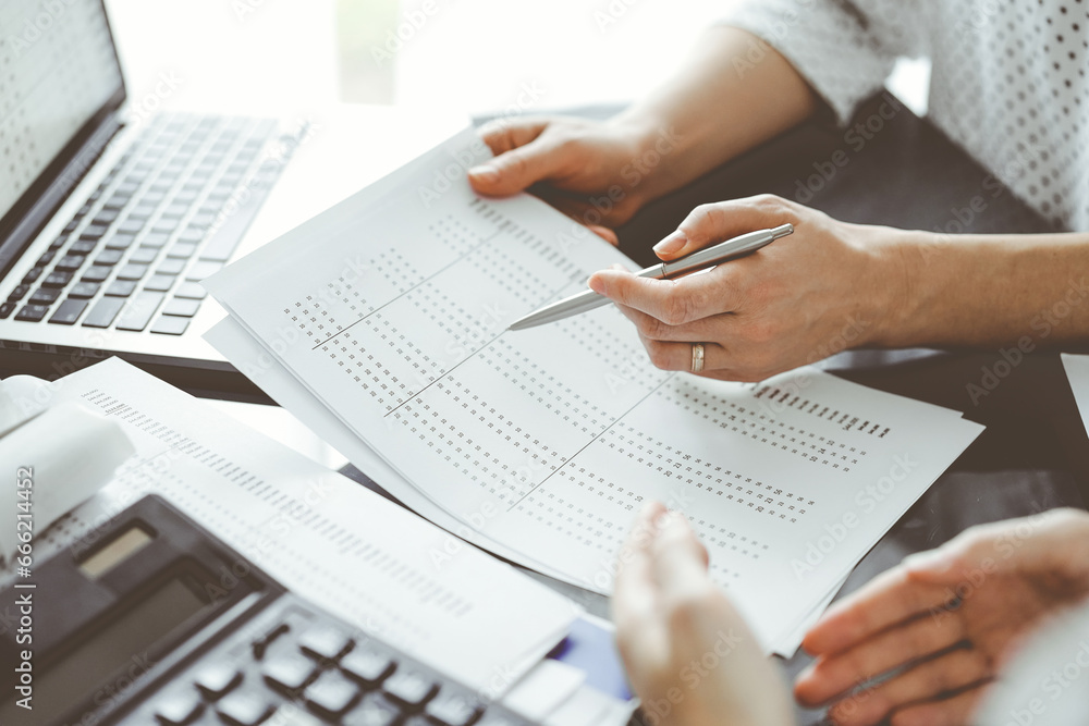 Female accountant pointing with a pen into audit paper while explaining tax counting results, close up. Business audit and finance concepts