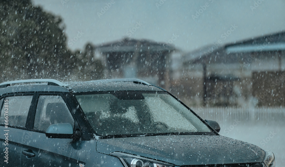 Heavy rain with hail at summer on car parking