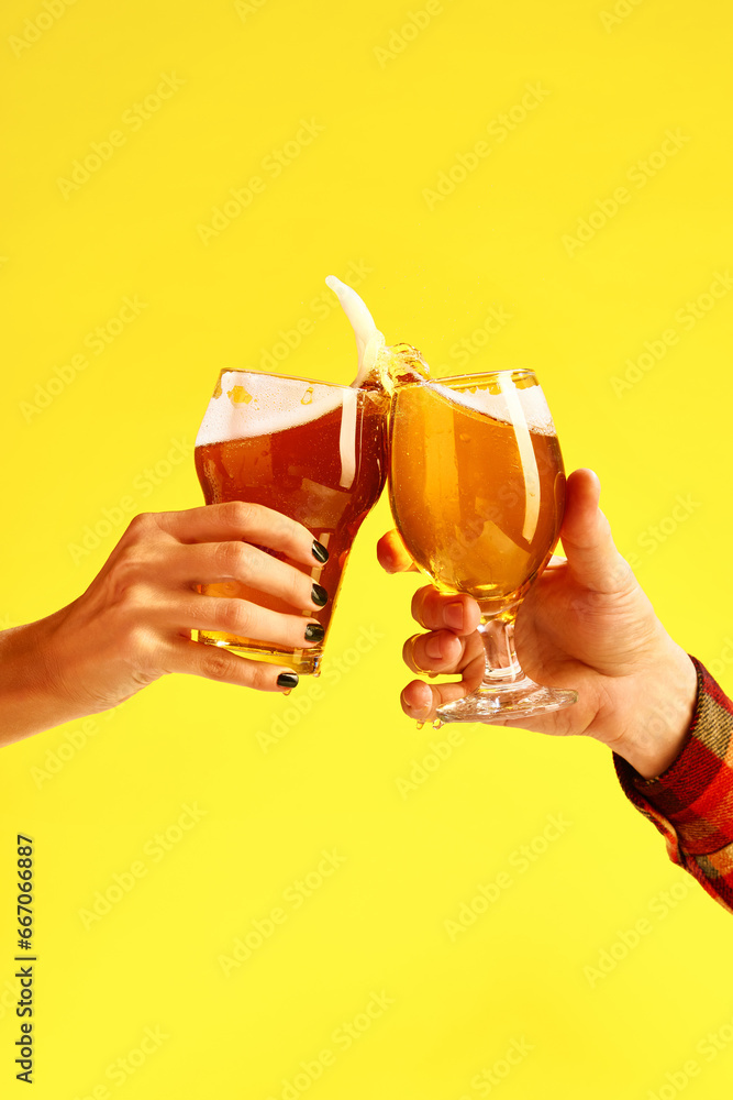 Couple toasts with glasses of cold beer. Two hands holding lager beer glass and clinking isolated on yellow background.