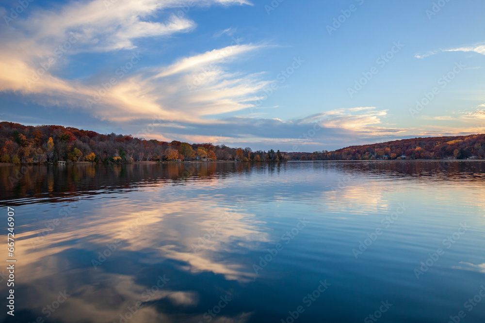 Calm lake in Minnesota with hills and trees in autumn color below beautiful clouds at sunset
