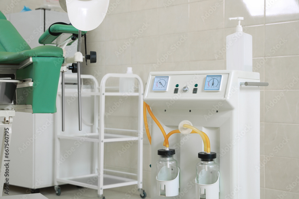 Examination room with medical aspirator for artificial abortion in clinic. Gynecological checkup