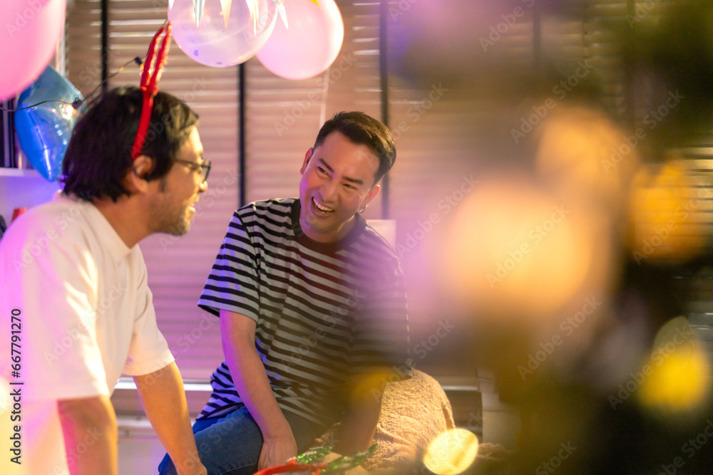 casual fun talk friend conversation group of cheerful party friend sit relax talking fun laugh cheerful on sofa in living room with party decorative house interior background