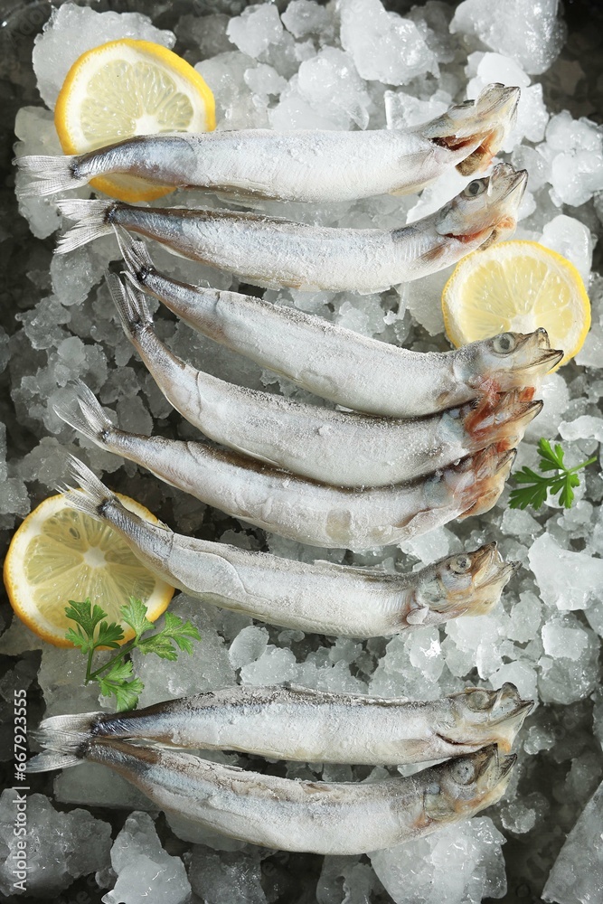Frozen Capelin Shisamo Fish on Wooden Table, Top View