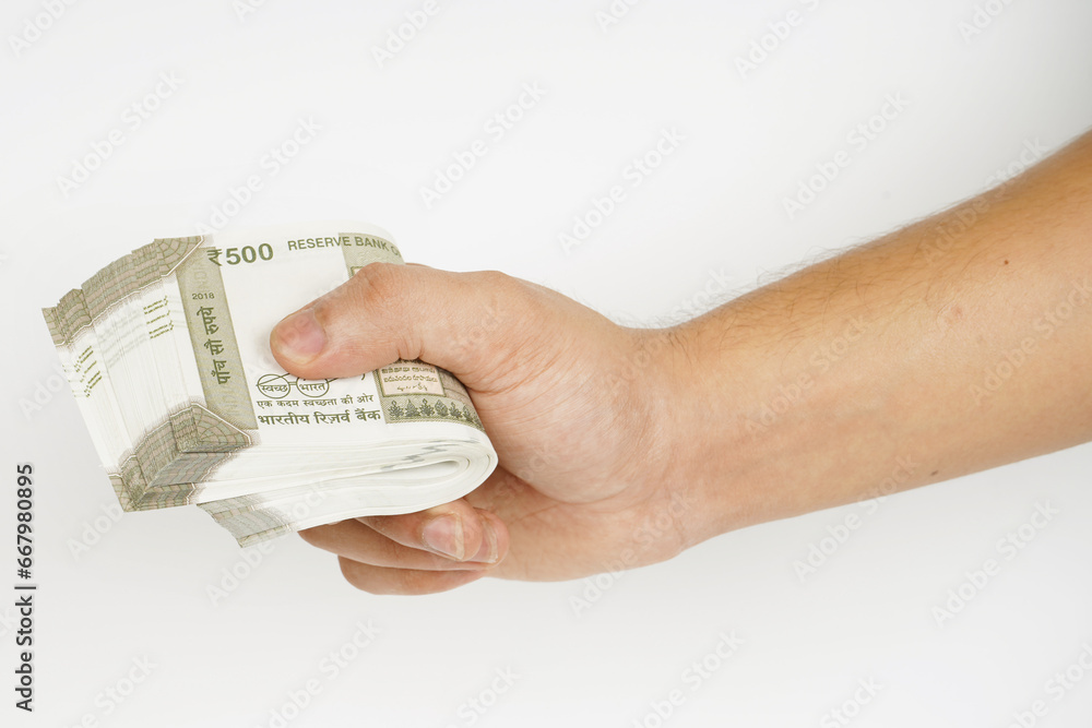 Bundle of indian rupees in hand on white background