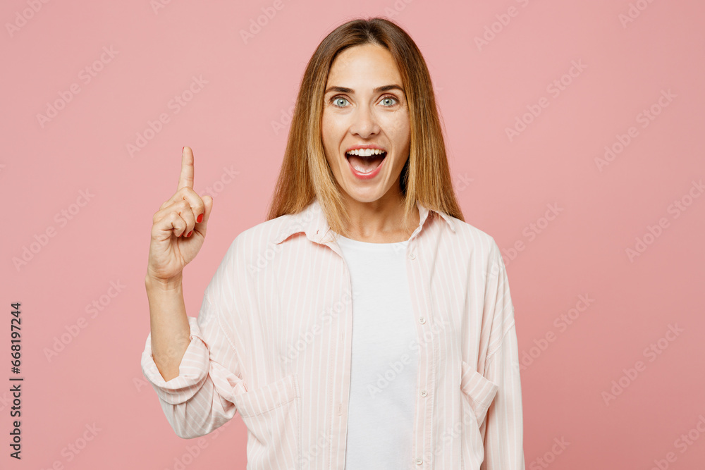 Young proactive happy woman she wear shirt white t-shirt casual clothes holding index finger up with great new idea isolated on plain pastel light pink background studio portrait. Lifestyle concept.