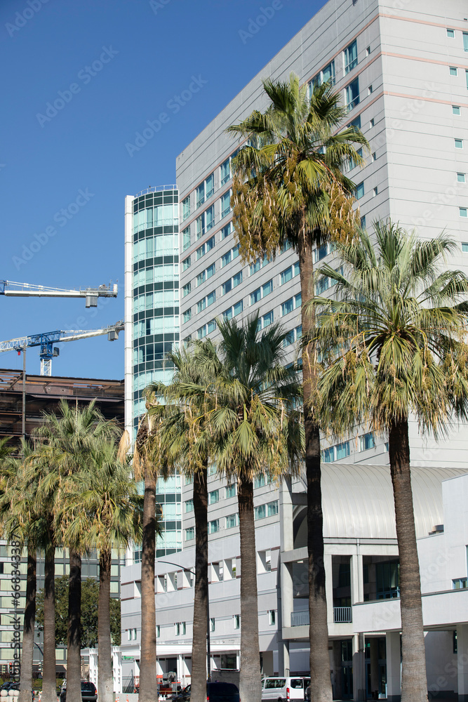 Daytime tree framed view of the downtown skyline of San Jose, California, USA.