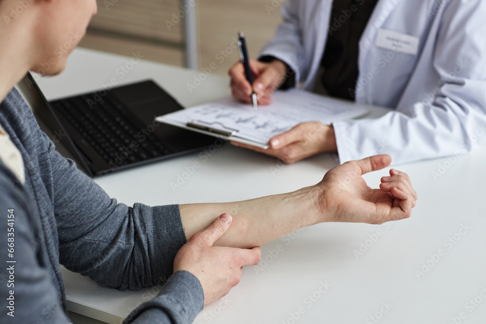 Close up of young man showing skin on forearm during visit to dermatology clinic, copy space