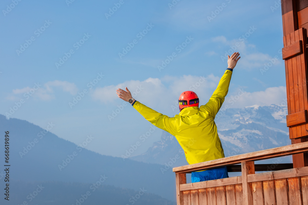 Man in ski outfit enjoys Alps view from chalet