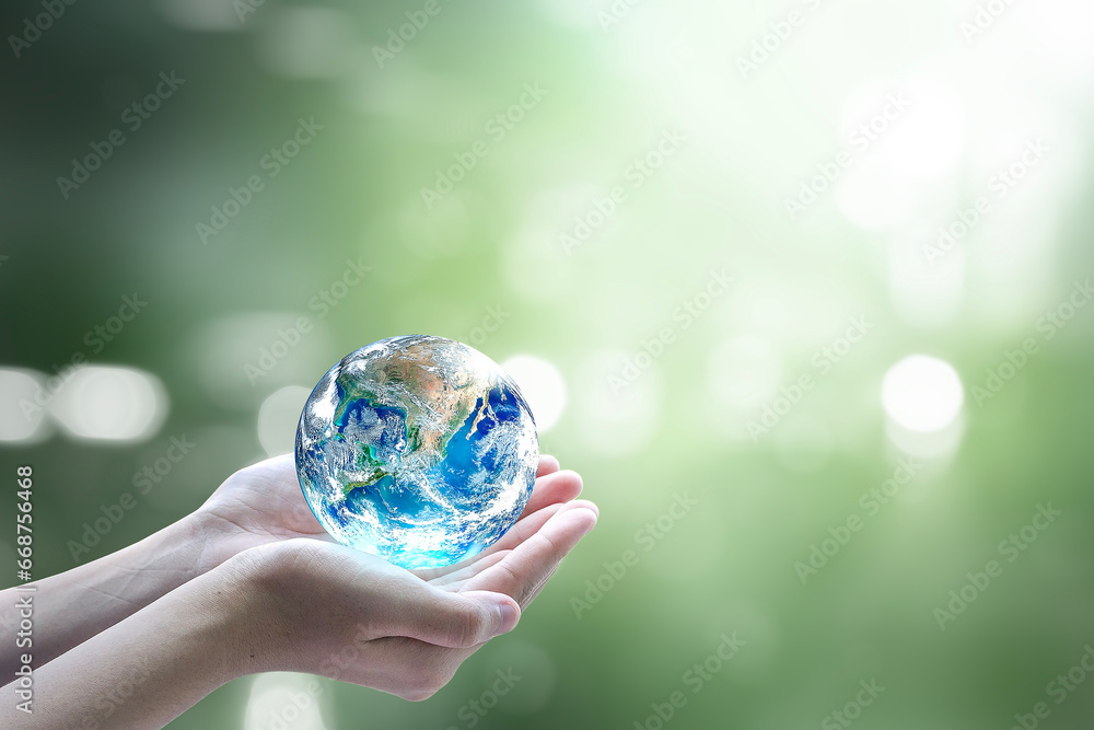 World environment day concept:Human hands holding earth globe on blurred beautiful green background. Elements of this image furnished by NASA