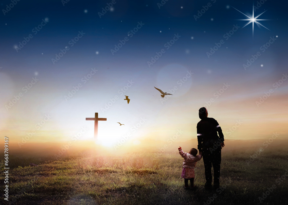 Christmas concept, silhouette mother and daughter looking for cross on grass at night sky with stars background