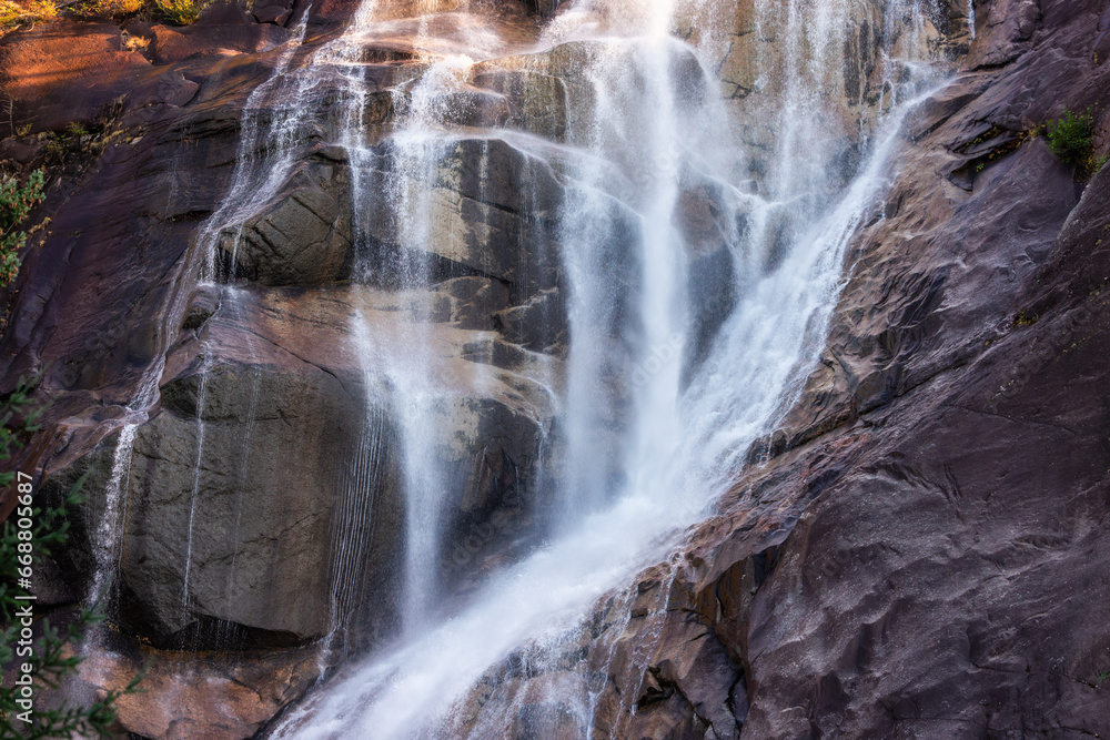 Waterfall rushing down the rocks. Sunset. Shannon Falls, Squamish, BC, Canada.