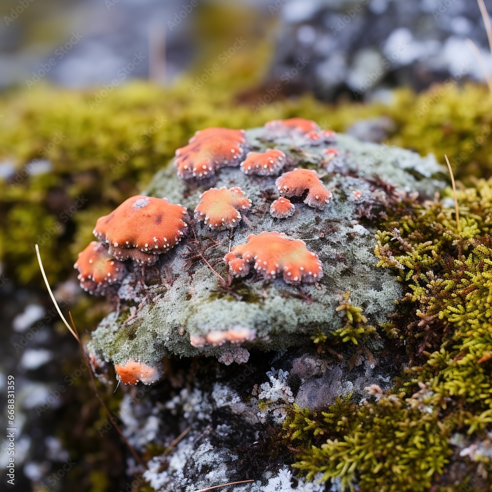 Close up of colorful lichens growing on a rock in the tundra. Various shades of green, yellow, orange, and red, and they contrast beautifully with the gray rock.