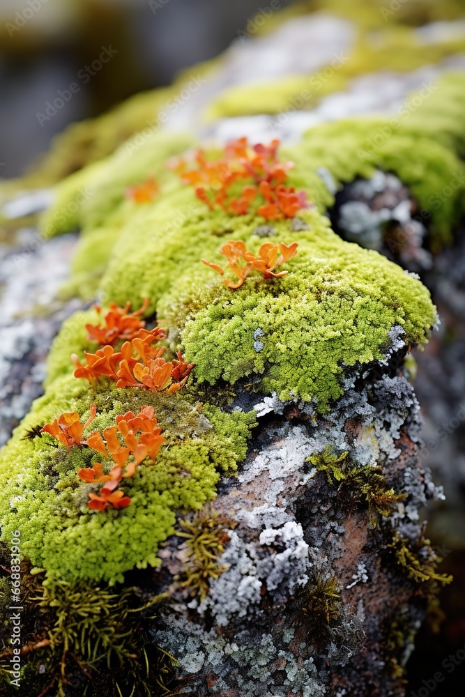 Close up of colorful lichens growing on a rock in the tundra. Various shades of green, yellow, orange, and red, and they contrast beautifully with the gray rock.