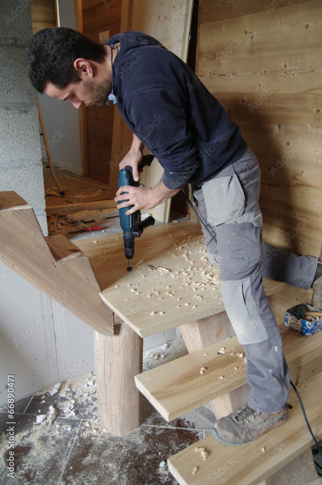 menuisier au travail - fabrication d'escalier