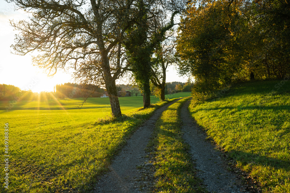 Autumn in England, green pastures beautiful landscape with the sun at the horizon