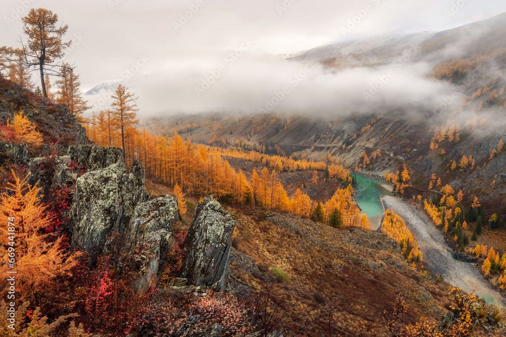 Stony steep slope and forest in dense fog. Hillside with larches trees in morning in thick low clouds. Altai in the fall, Argut river. Beautiful autumn landscape, valley, mountains, river, autumn tree