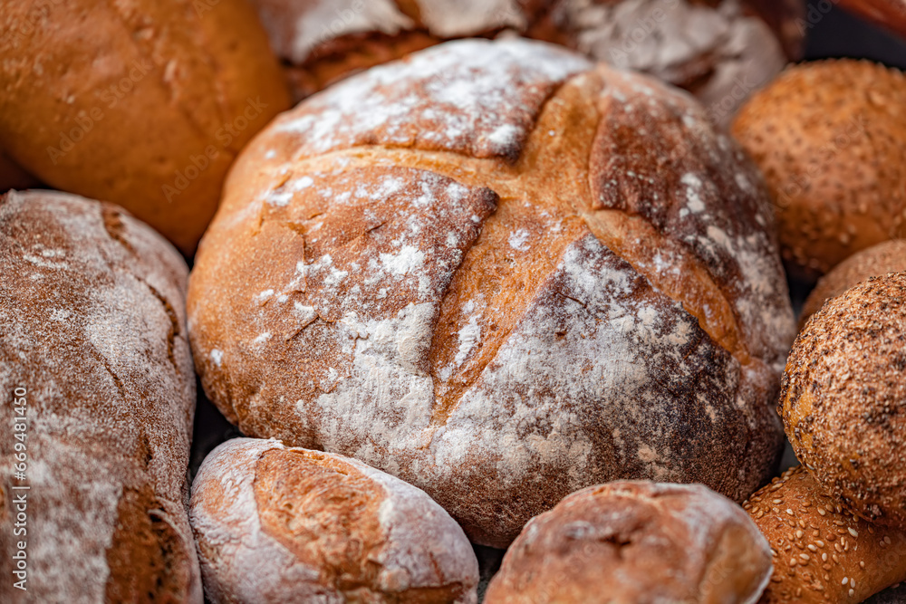 Freshly baked natural bread is on the kitchen table.