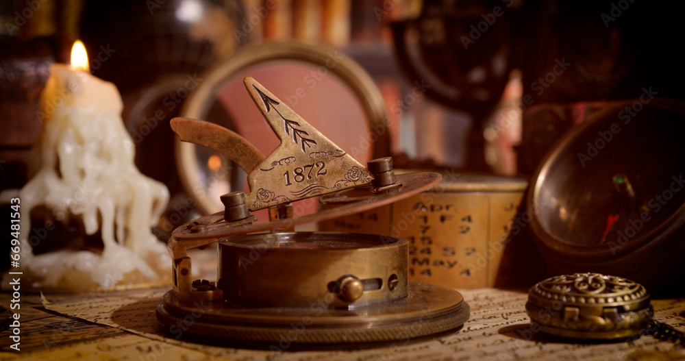 Vintage style travel and adventure. Vintage old compass and other vintage items on the table.