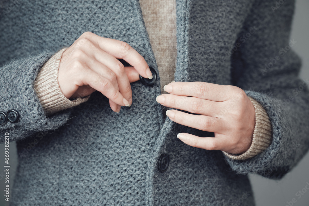 Close-up of a gray knitted jacket. Women's hands fasten buttons. Winter, autumn warm woolen clothes.