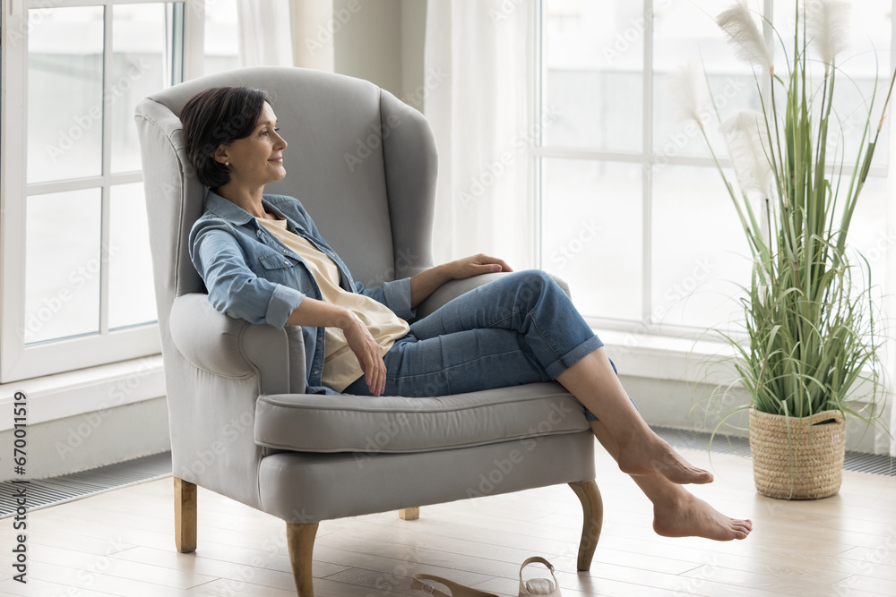 Serene attractive mature woman sit on armchair in modern living room looking away, enjoy lazy weekend, daydreaming, have peaceful leisure, relaxing alone at home. Lifestyle, cozy furniture, pastime
