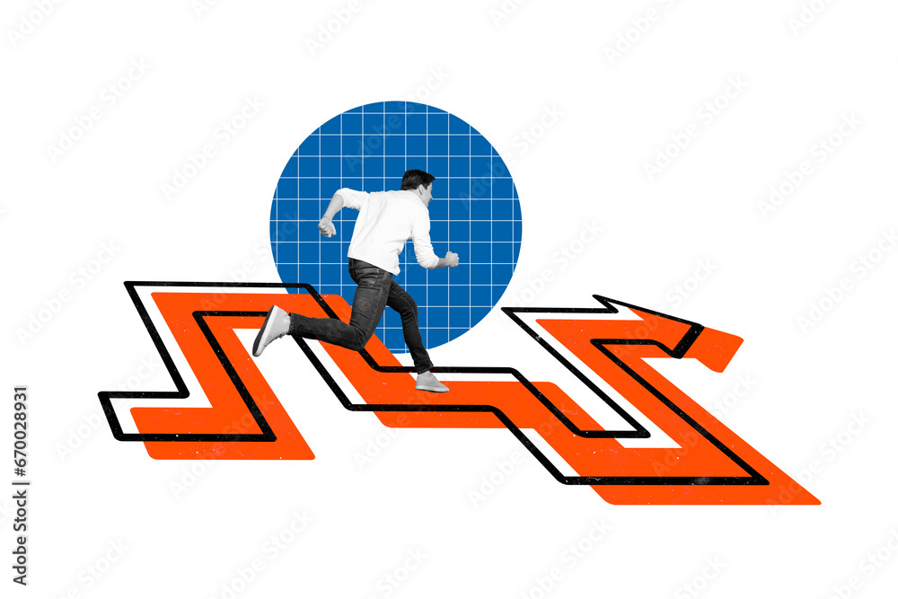 Collage picture of black white colors guy hurry running painter arrow direction pointer labyrinth isolated on creative background
