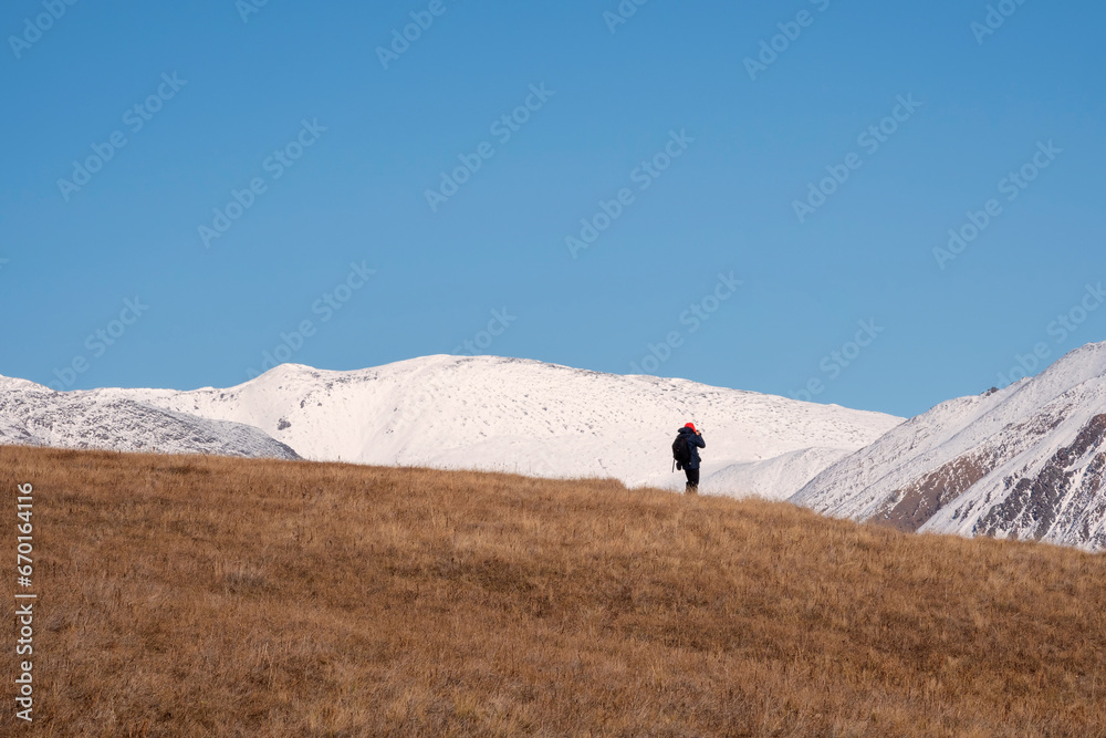 Back of girl while climbing on the top of mountain. Woman photographer with a backpack walking on snow. Blue sky. Copy space.