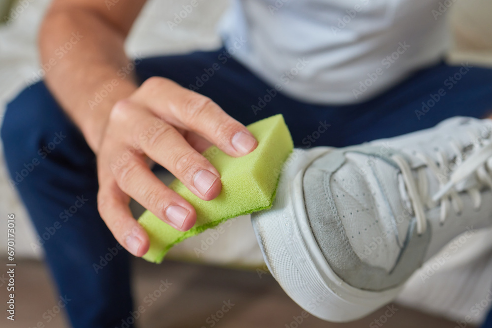 Cleaning suede sneakers. A worker in a shoe workshop cleans a pile of shoes