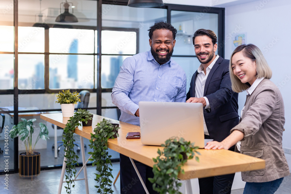Team of diversity business people is discussing over the new strategic strategy project on investment real estate inside eco friendly office full of house plant with modern building skyscraper view