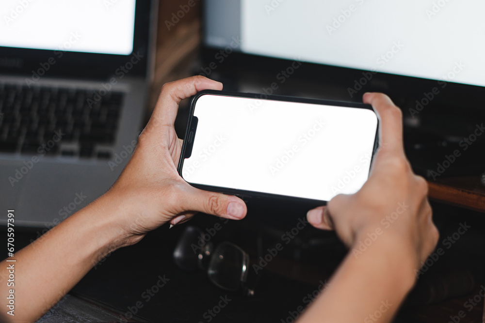 Mockup image of woman's hands holding black mobile phone with blank screen