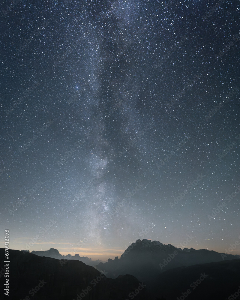 Vertical shot of starry sky and milky way above sharp mountains, Dolomites, Italy