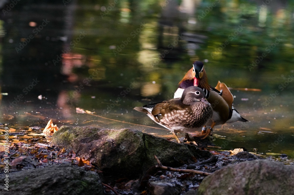 Para kaczek mandarynek stojąca na skale na stawie w parku miejskim w słoneczny jesienny dzień