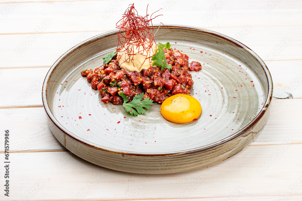 Veal tartare with jelly and mustard. Haute cuisine. On a wooden background.